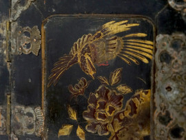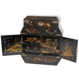 Mobiletto portagioie in legno ebanizzato con decorazione policroma a chinoiserie, XX secolo, cm h 27,7x23,5x11 (difetti e mancanze)