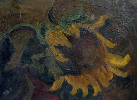 Natura morta con vaso di girasoli, olio su tavola, firmato e datato in basso a destra [...] [19]42, cm 49,8x39,5, entro cornice