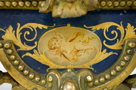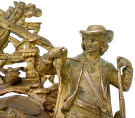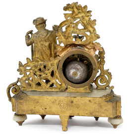 Orologio da camino in ottone e alabastro, con rappresentazione di un cacciatore di quaglie, C. Detouche, Parigi, XIX-XX secolo, altezza cm 33 (difetti e meccanismo da revisionare)