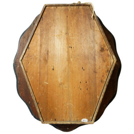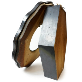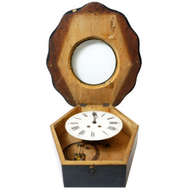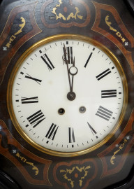 Orologio da parete occhio di bue in legno ebanizzato intarsiato in varie essenze con inserti dorati, Francia, fine del XIX secolo, cm 58,5x50 circa (difetti e meccanismo da revisionare)