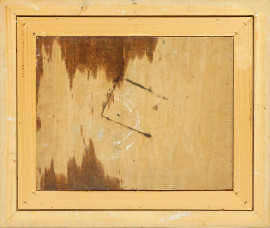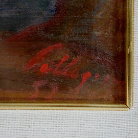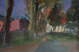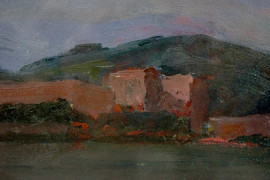 Paesaggio fluviale con case, olio su compensato, cm 40x50, firmato, entro cornice