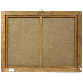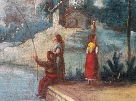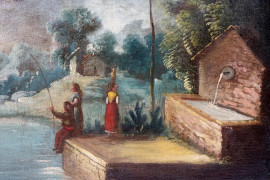 Paesaggio fluviale con fontana e figure, fine XIX secolo, olio su tela, cm 61x82, entro cornice