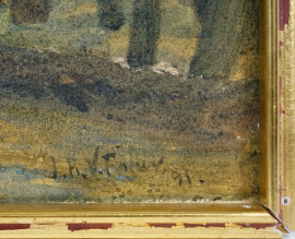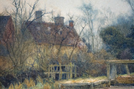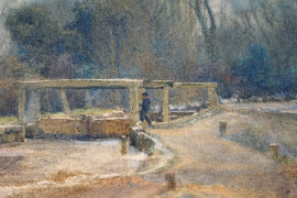 Paesaggio fluviale con ponte e case, acquerello su carta, firmato e datato in basso a destra, cm 31,2x48,7