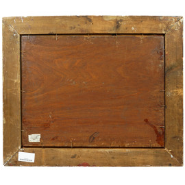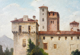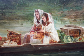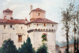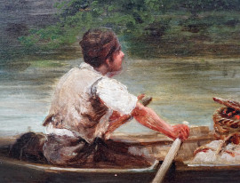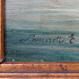 Paesaggio lacustre con villa e barca con figure, olio su tavola, firmato in basso a sinistra, cm 40x50, entro cornice.