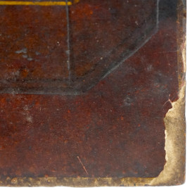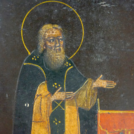 Piccola icona di San Sergio di Radonezh il taumaturgo, al capezzale dei suoi genitori, i santi Cirillo e Maria sul letto di morte, sullo sfondo un'icona del Mandylion, tempera su tavola, fine XIX-inizi XX secolo, cm 13,3x10,2, (piccole cadute di colore)