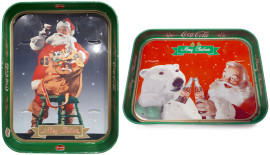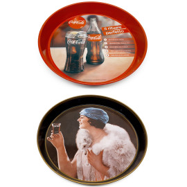 Piccola rara collezione di vassoi e locandine in latta a marchio Coca Cola composta da due vassoi rettangolari cm 21x28, due vassoi tondi diametro cm 35 e 30, due locandine in latta cm 50x30 e 35x28