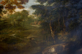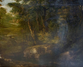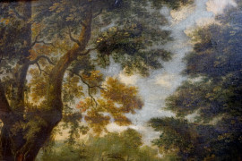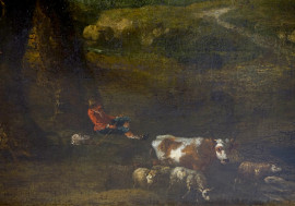 Pittore fiammingo-olandese della fine del XVIII secolo, Paesaggio con pastore e armenti, olio su tela, cm 85,5x118,5, entro cornice