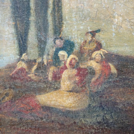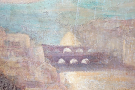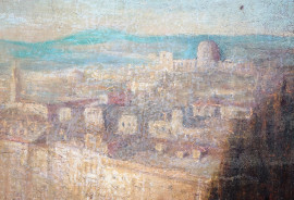 Pittore toscano del XIX secolo, Veduta di Firenze da Piazzale Michelangelo con concertino, olio su tela, cm 71.5x91.5, entro cornice, (difetti)