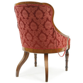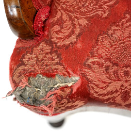 Poltrona in legno, imbottita e rivestita in broccato rosso, gambe posteriori mosse e anteriori tornite, XX secolo, cm 86x56x55.5 (difetti)