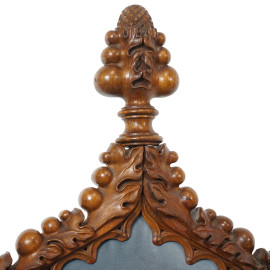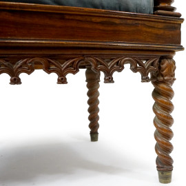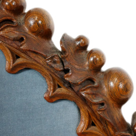 Poltrona in stile neorinascimentale, struttura in noce riccamente scolpita, schienale, seduta e braccioli imbottiti e rivestiti in tappezzeria blu, cm h 133x59x67