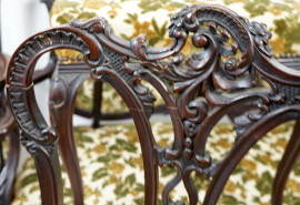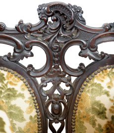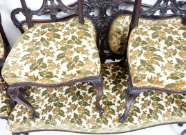 Salotto Liberty composto da un divano a due posti, due poltrone e quattro seggiole in legno intagliato, sedute imbottite e rivestite in tappezzeria floreale verde. Misure del divano cm h 101x130x55 circa, seggiole cm h 96, (difetti)