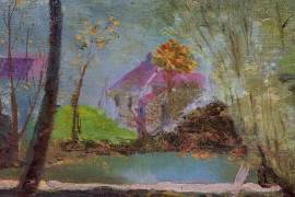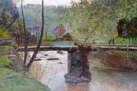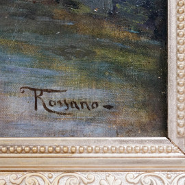 Scorcio con fiume e case, olio su tela, firmato in basso a destra, cm 43,5x55, entro cornice.