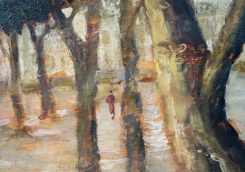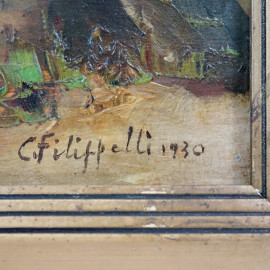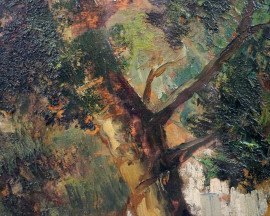 Scorcio di parco con figura, olio su compensato, firmato, cm 40x30, entro cornice