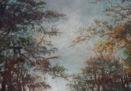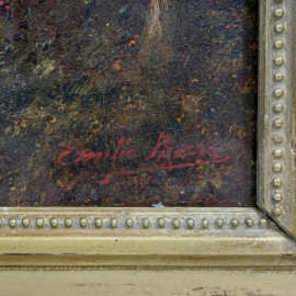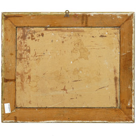 Scorcio di sentiero con figure, olio su tela riportato su cartone, firmato, cm 47x61,5, entro cornice