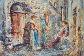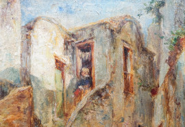 Scorcio di vicolo con figure, olio su tela, cm 48x33, XX secolo, entro cornice