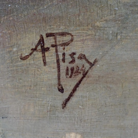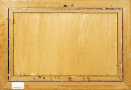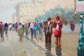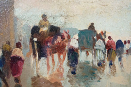 Scorcio urbano con figure, olio su compensato, firmato e datato in basso a sinistra, cm 30x50, entro cornice.