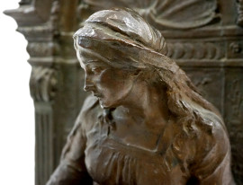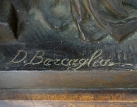 Scultura in bronzo raffigurante la Madonna in trono con il Bambino, base in legno, firmata D. Barcaglia, cm 61,5x26,5