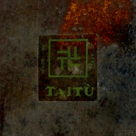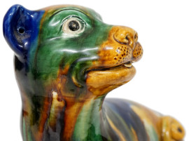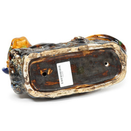 Scultura in ceramica policroma rappresentante un felino, recante etichetta Taitu, Italia, XX secolo, cm 32,5x27 (mancanze)