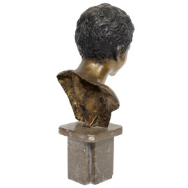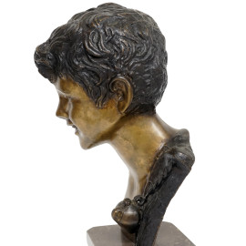 Scultura rappresentante uno scugnizzo, in metallo brunito, piedistallo in marmo, firmata De Martino, altezza cm 32