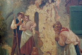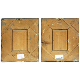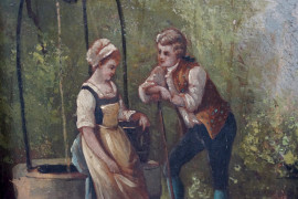 Scuola francese del XIX secolo, Coppia di scene di corteggiamento, olio su tavoletta, cm 14x10, entro cornici