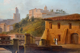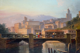 Scuola italiana della fine del XIX secolo, Veduta di città con ponte, olio su cartoncino, entro cornice, cm 30x20,2
