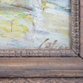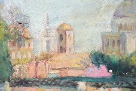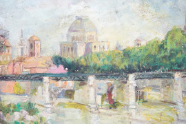 Scuola romana degli anni '50, Veduta di Roma con la Sinagoga, olio su tela, cm 25x35, entro cornice, (lievi difetti)