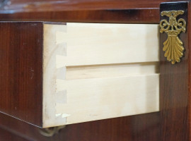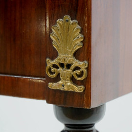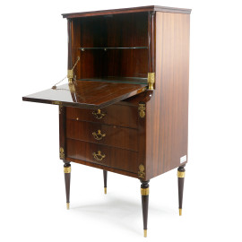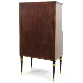 Secretaire anni '60 in legno impiallacciato con inserti in metallo dorato, poggiante su 4 gambe a cono, cm h 111,5x63x36,8 (difetti)