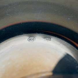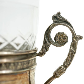 Servizio da sei bicchierini in argento e vetro controtagliato, Vercelli, XX secolo, altezza cm 7, diametro piattino cm 10,2, peso gr. 400