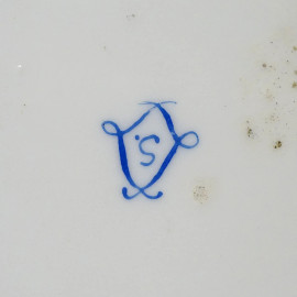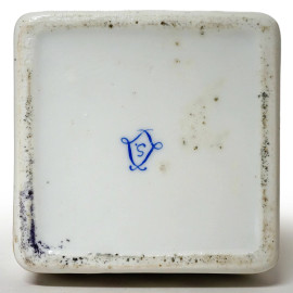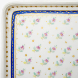 Set da scrivania in porcellana policroma, composto da un flacone ed un tampone da inchiostro, un tagliacarte, un barattolino ed un vassoio, marca sotto la base, misure del vassoio cm 16,5x25, (difetti, restauri)