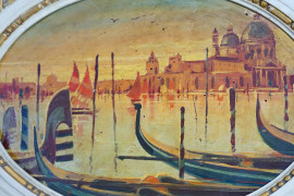 Specchiera in legno intagliato e laccato con finiture dorate, decorato a motivi floreali, inserto dipinto con una veduta di Venezia, XX secolo, ingombro cm 196x89
