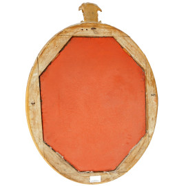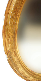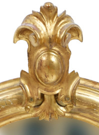 Specchiera ovale, XIX secolo, cornice in legno dorato con decori a bulino, cimasa scolpita, cm 96x69,5, (difetti)