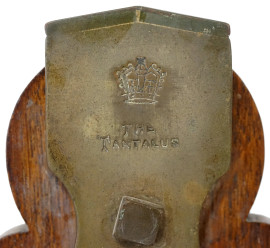 Tantalo in legno e ottone con tre grandi decanter con tappo in vetro controtagliato, Betjemann's Patent London, Mappin Brothers, XIX secolo, cm 29x34,5