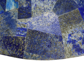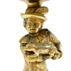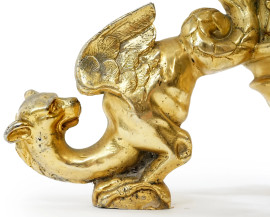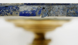 Tavolino da centro, XX secolo, con piano impiallacciato in lapislazzulo, supporto in metallo dorato raffigurante personaggio di corte, tre piedi a foggia di grifoni, h 76x80,5, (difetti)