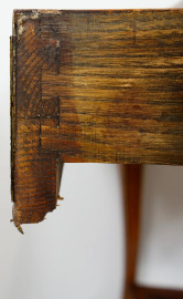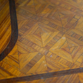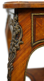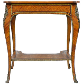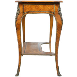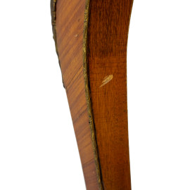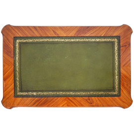 Tavolino da lavoro in legno impiallacciato, metà del XX secolo, piano sagomato con inserto in pelle verde, un cassetto nella fascia, quattro gambe mosse riunite da pianetto, ferramenta in metallo dorato, cm h 67,5x61x42, (difetti)