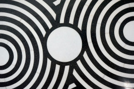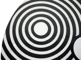 Tavolino in marmo nero e bianco, piano circolare con disegni a cerchi concentrici, diametro cm 64,5, altezza cm 55, (difetti)