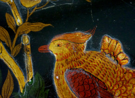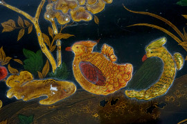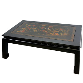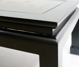 Tavolo basso in legno laccato nero, arte orientale, XX secolo, piano con pannello incassato decorato a rilievo, cm h 46x75x130, (difetti)