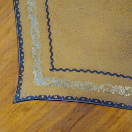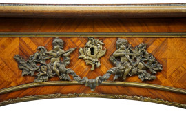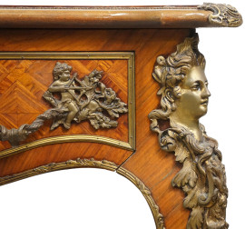 Tavolo scrittoio da centro in legno impiallacciato, metà del XX secolo, piano sagomato con inserto in pelle, tre cassetti nella fascia, quattro gambe mosse, ferramenta in metallo dorato, cm h 79x157x85, (difetti)