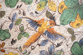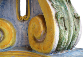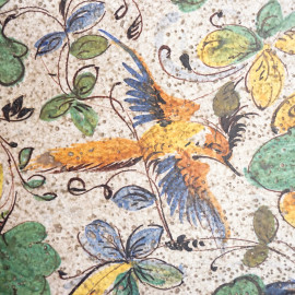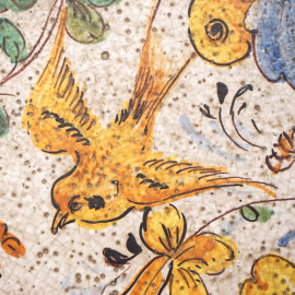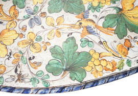 Piano riccamente decorato a motivi vegetali con uccellini ed insetti, bordo a nastro ritorto blu. Montante centrale a tre a volute poggianti su base trilobata.