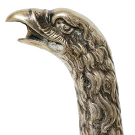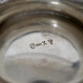 a superficie liscia con profili a foglie lanceolate, beccuccio zoomorfo, coperchio centrato da presa a pigna, ansa sagomata. Punzoni sotto la base.