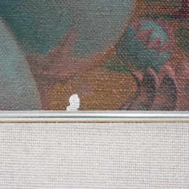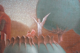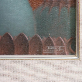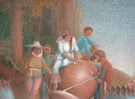 Paesaggio fantastico con folletti, olio su tela, cm 34x43, entro cornice, (cadute di colore)