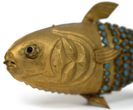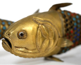 Tre pesci in metallo dorato con applicate pietre dure e smalti, arte orientale, XX secolo, lunghezza max cm 16, (lievi difetti)
