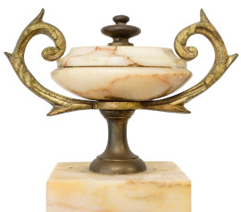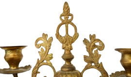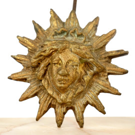 Trittico da camino composto da un orologio e due candelabri in marmo e bronzo dorato, Francia, XX secolo, altezza max cm 38 (difetti, meccanismo da revisionare)