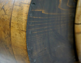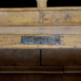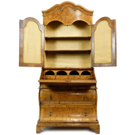 Trumoncino in radica, prima metà del XX secolo, parte superiore a due sportelli con specchi, parte inferiore con ribalta e quattro cassetti, piedi a mensola, cm h 204x44.5x90, (difetti)