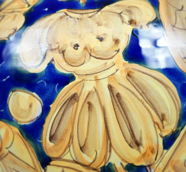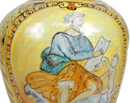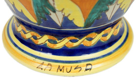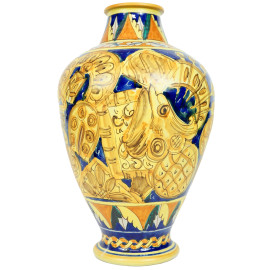Vaso in ceramica policroma, corpo decorato con grande riserva raffigurante San Matteo, XX secolo, firmato La Musa, altezza cm 51 (lievi difetti)