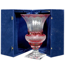 Vaso in cristallo controtagliato color rosso rubino, Fabergè Imperial collection, XX secolo, cm h 25, entro scatola originale, (difetti)
