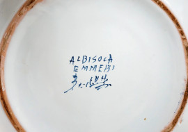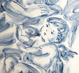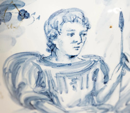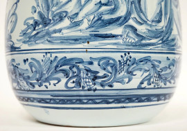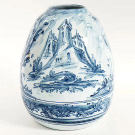 Vaso in maiolica Savona, Albisola, Bottega Emmebi, firmato Bartolotti, seconda metà del XX secolo, a smalto bianco e blu con decoro al fronte raffigurante Tancredi e Clorinda, al retro un paesaggio, cm h 31