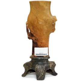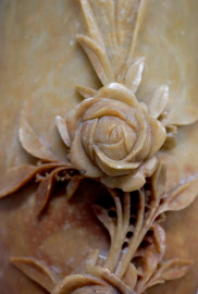 Vaso in pietra saponaria, arte orientale XX secolo, con decoro scolpito a rilievo raffigurante ramo con rose, cm h 29,5, (difetti)