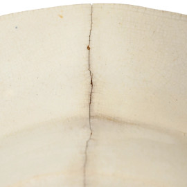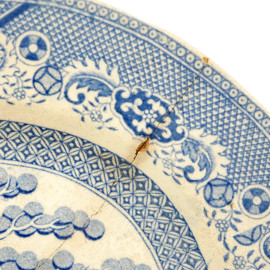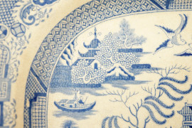 Vassoio in porcellana bianca e blu con decori a chinoiserie, Inghilterra, fine XIX secolo, cm 35,5x28 (difetti)