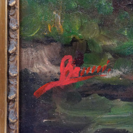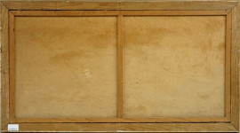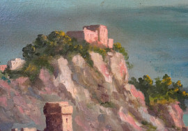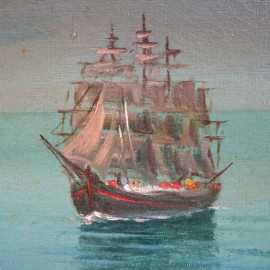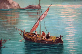 Veduta costiera con imbarcazioni, olio su tela, XX secolo, cm 59,5x118,5