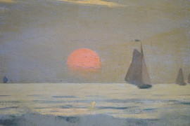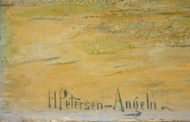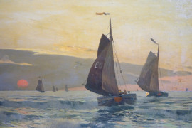 Veduta marina al tramonto, olio su tela, firmato H. Petersen Angeln, cm 80x125, (difetti)